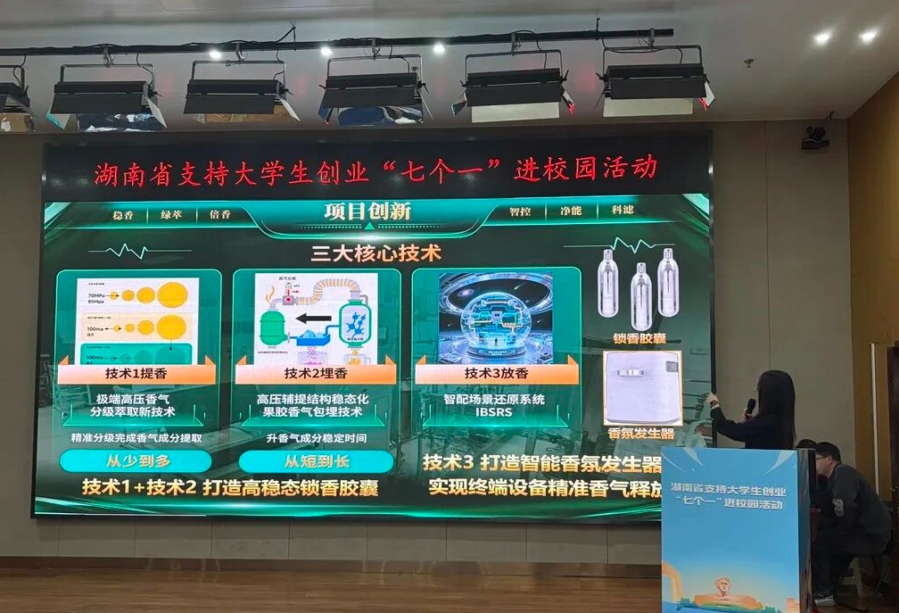 中国农业大学的林一带来的“超高压提香”技术,开场便引人注目。“会议室放点薄荷香,会议时间能缩短23%,吵架概率下降60%。”技术本身同样硬核:用低温高压工艺替代传统高温蒸馏,提香纯度从60%提升至90%以上。
